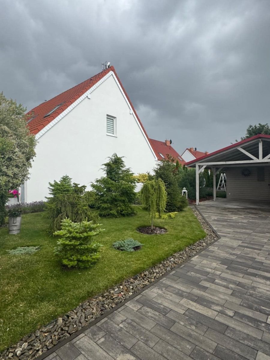 Prawdziwą perełką tej nieruchomości jest zaprojektowany z sercem ogród. Przemyślane nasadzenia, nastrojowe oświetlenie oraz duży, zadaszony, zabudowany taras zapewniają pełną intymność i komfort. To idealne miejsce na poranną kawę, rodzinne obiady czy wieczorny relaks w otoczeniu zieleni.