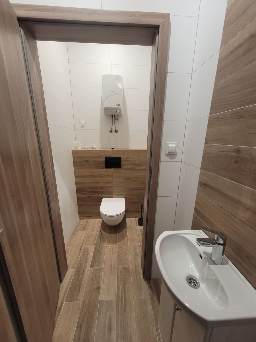 Na piętrze, na które oprócz klatki schodowej wjedziemy również windą znajdziemy toaletę dla niepełnosprawnych, toaletę ogólną oraz pomieszczenie socjalne.