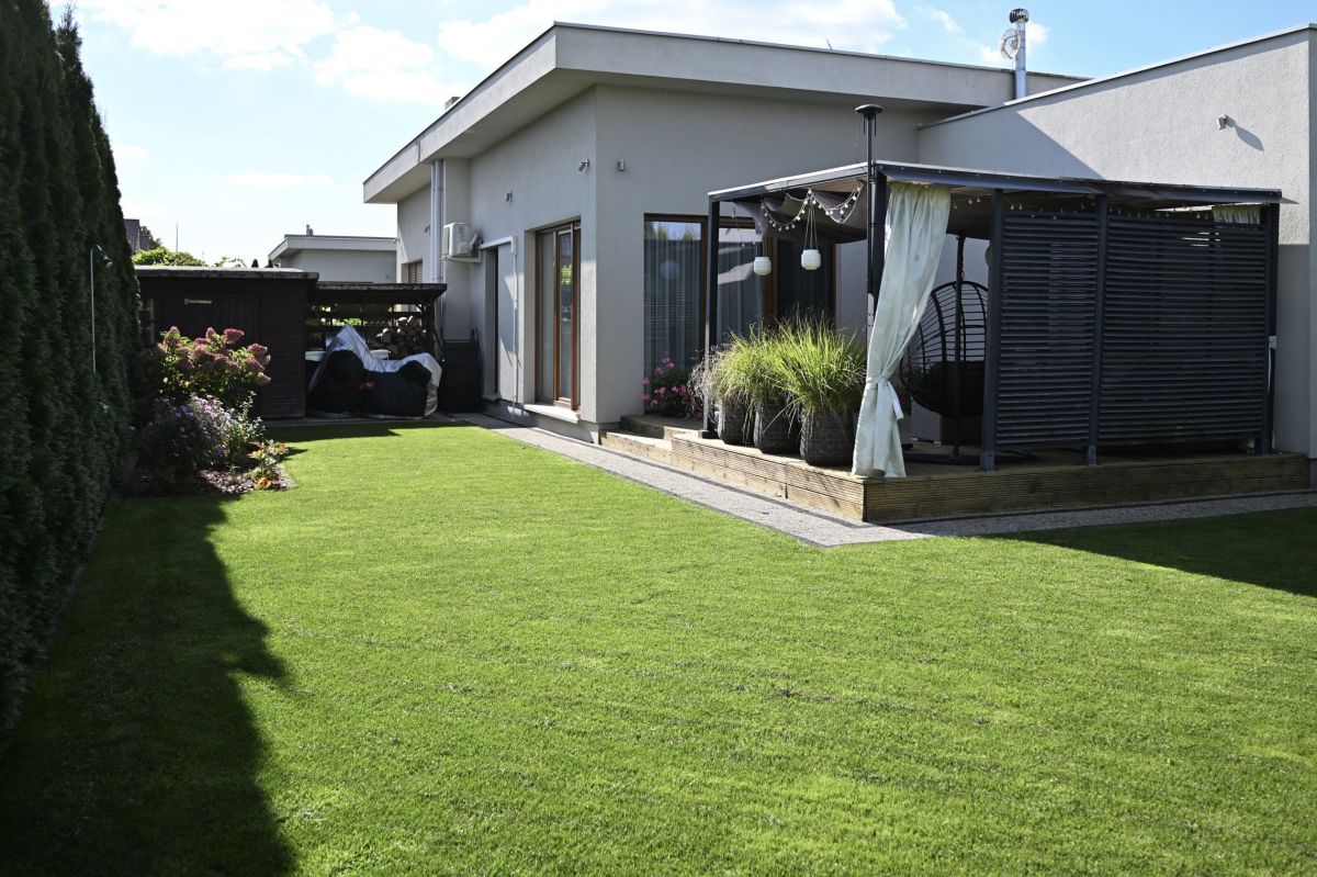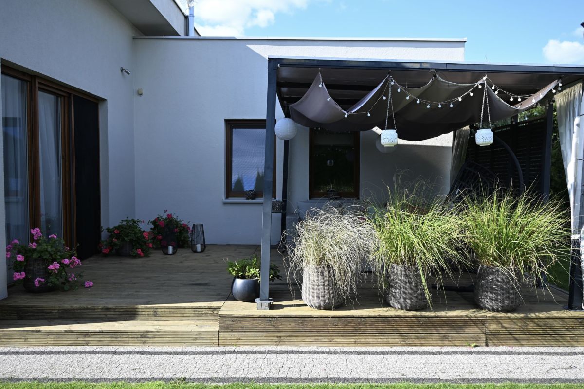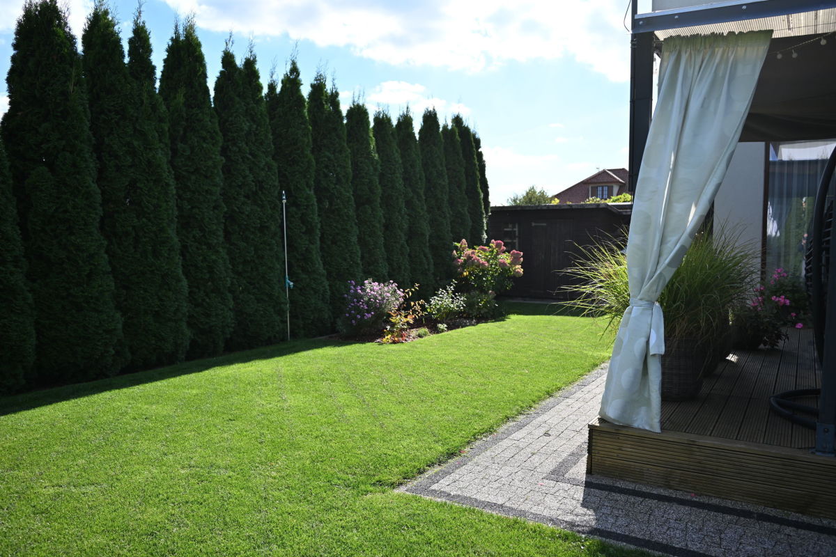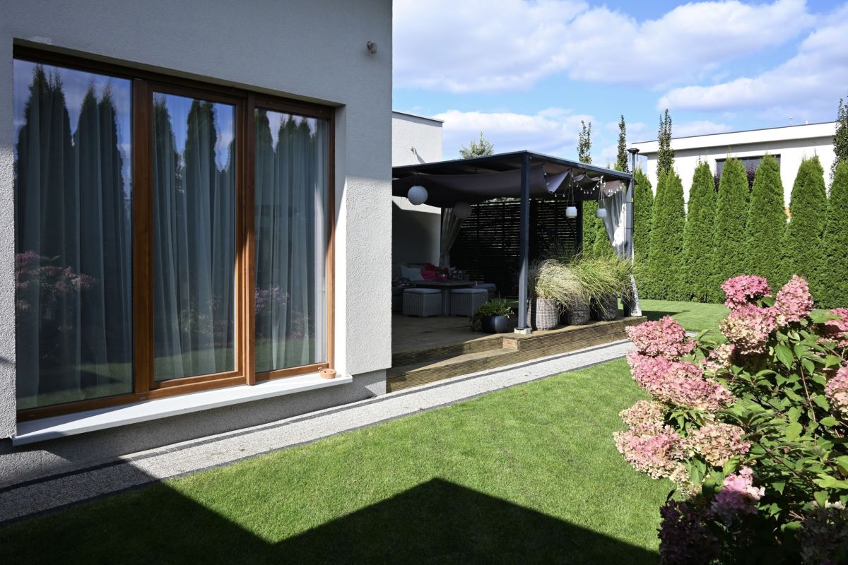 Jednym z największych atutów nieruchomości jest piękny, zadbany ogród z automatycznym nawadnianiem— idealne miejsce do relaksu, odpoczynku na świeżym powietrzu czy organizacji spotkań rodzinnych. Do ogrodu przylega komfortowy taras, doskonały na poranne kawy, popołudniowe przekąski lub wieczorne rozmowy przy świetle lamp.